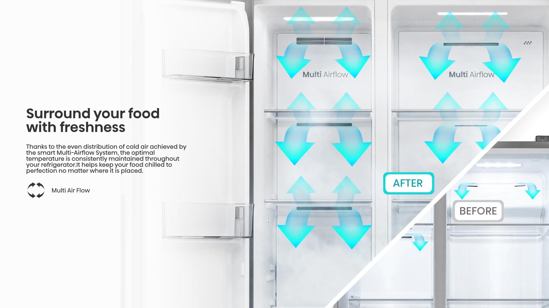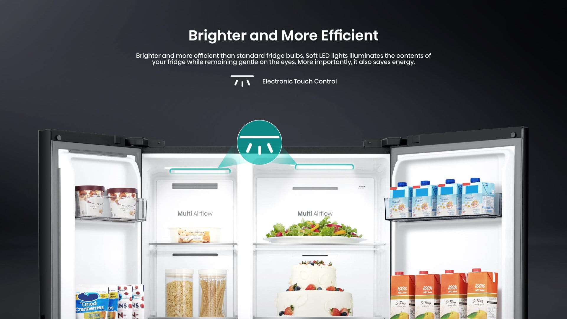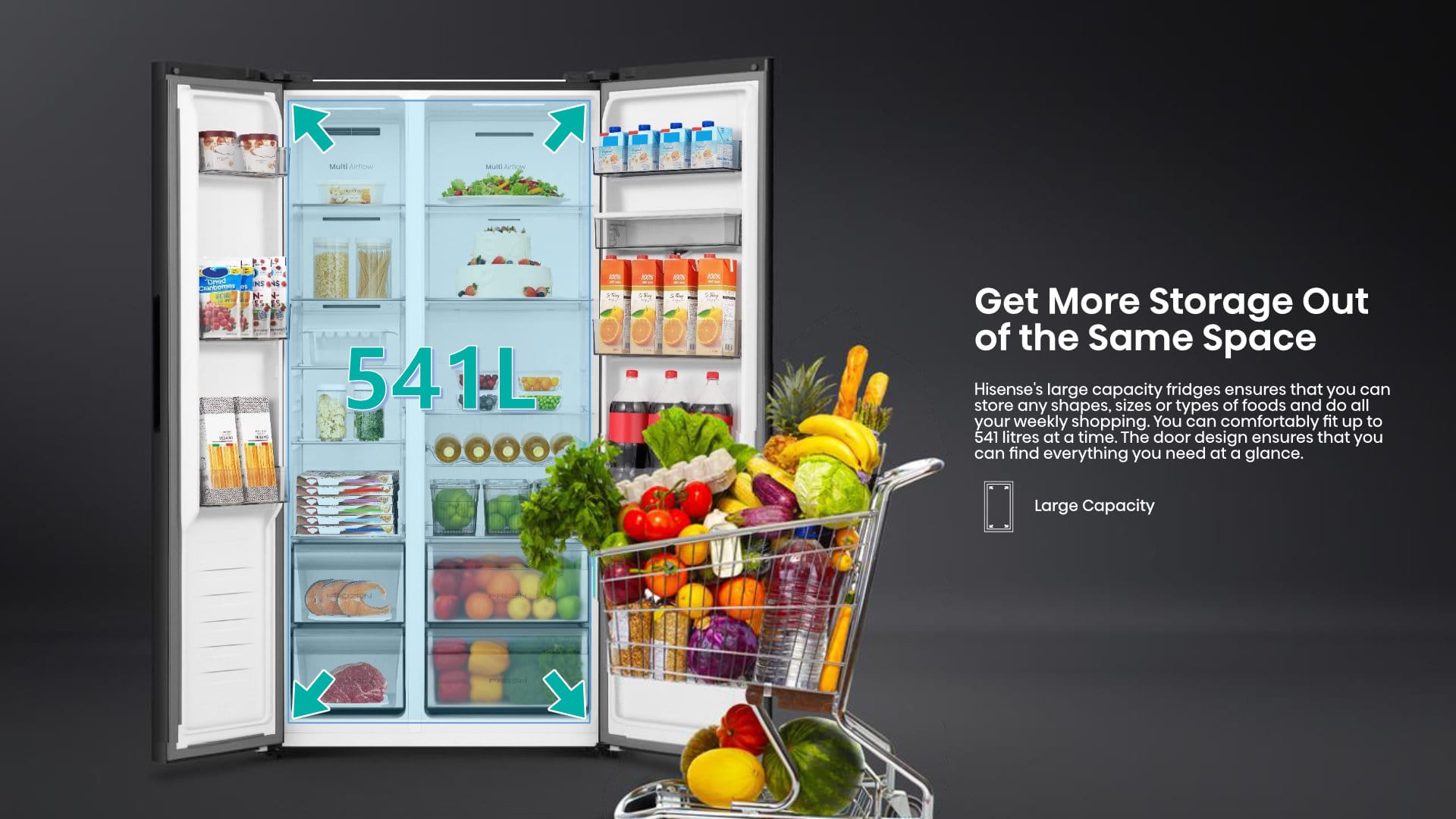 The Hisense REF558DR features advanced cooling technology that maintains consistent temperatures throughout the compartments. Therefore, food remains fresher for longer, and drinks stay perfectly chilled. In addition, its multi-airflow system distributes cool air evenly, preventing warm spots and helping to preserve the quality and taste of stored items. Whether you’re storing vegetables, dairy, or leftovers, everything stays at the right temperature.